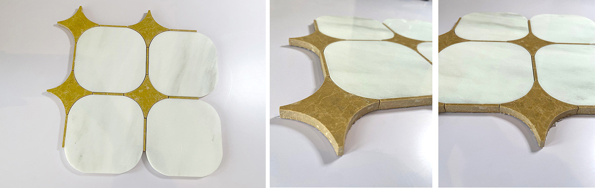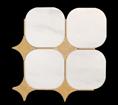 Crafted from mine-direct Milano White marble and accented with premium gold marble, this waterjet mosaic features a seamless geometric pattern achieved through high-precision cutting technology.